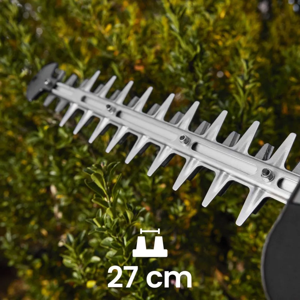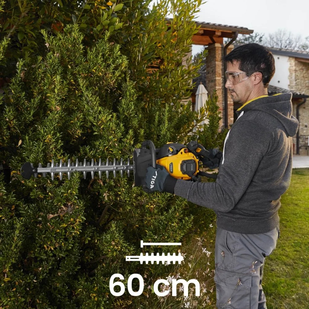 Laserom brúsené nože: Obojstranná lišta s celkovou dĺžkou 60 cm (pracovná časť 46 cm) zaručuje dokonale čistý a presný rez, ktorý je šetrný k rastlinám a podporuje ich zdravý rast.
