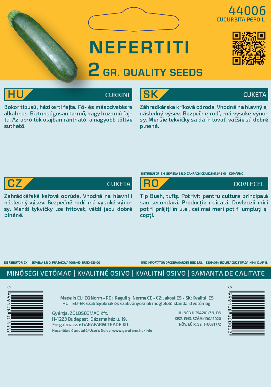 Nefertiti je kríčková odroda cukety, ktorá je vďaka svojej vysokej úrodnosti a stabilným výnosom ideálna pre domáce záhrady. Je vhodná na hlavný aj následný výsev, pričom jej mladé plody sú vynikajúce na vyprážanie a väčšie kusy sa skvele hodia na plnenie a pečenie.