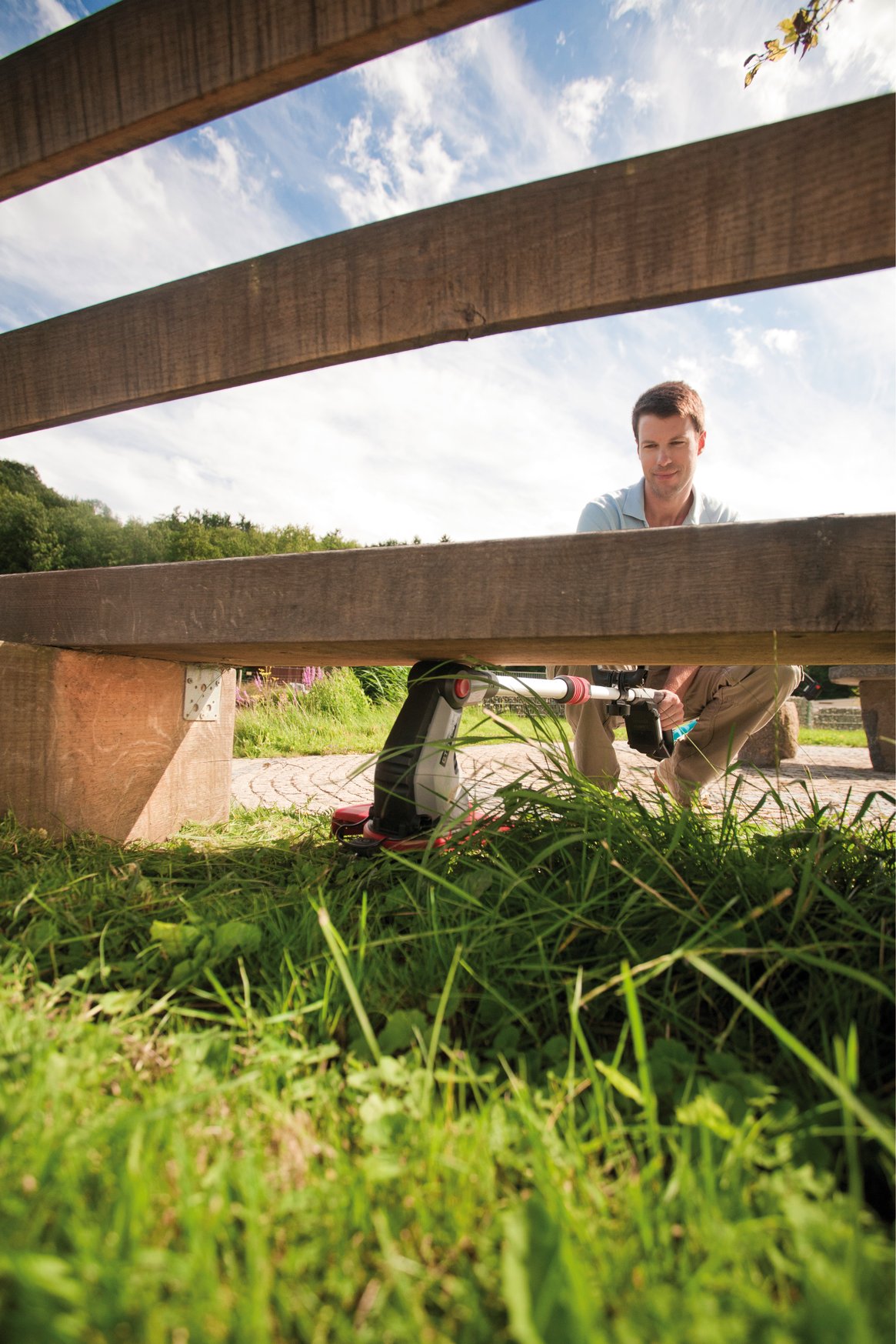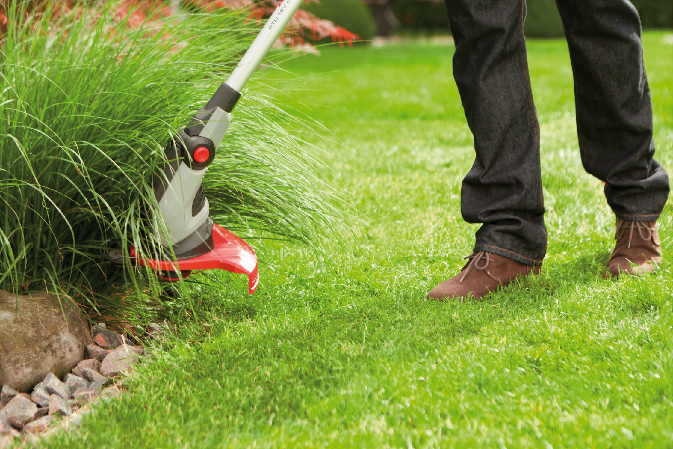 Flexibilná otočná hlavica: Rezná hlava je otočná o 180 stupňov a disponuje nastaviteľným sklonom. To umožňuje precízne vyžínanie aj na ťažko dostupných miestach a kolmé zastrihávanie okrajov trávnika.